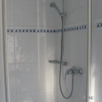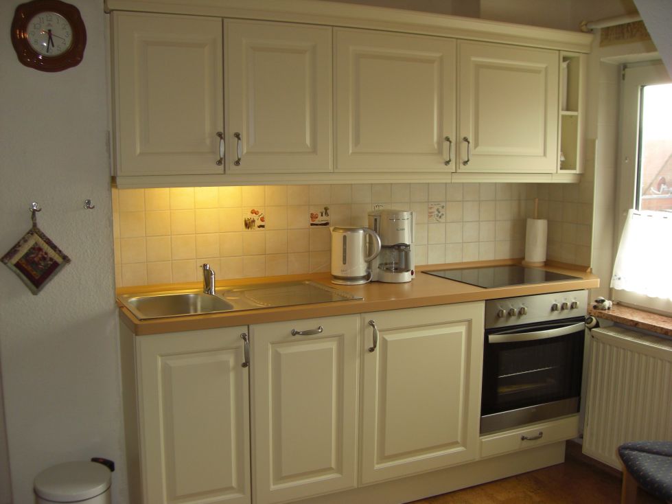 mit Backofen, Geschirrspülmaschine, Kaffeemaschine, Toaster), ein Badezimmer mit Dusche sowie ein zweites WC im Treppenhaus.
